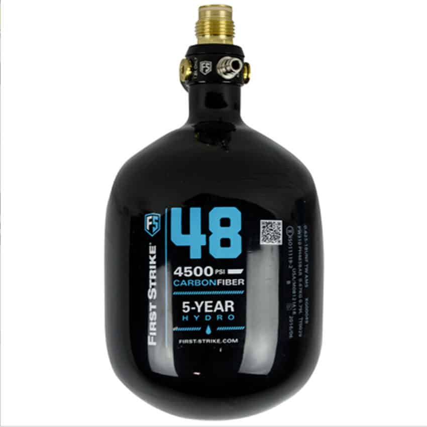 The First Strike Hero tanks are 30% lighter than standard Carbon Fiber wrapped bottles and feature the all new FS Hero regulator which has the lowest profile on the market. With the lighter material and the smallest regulator, these tanks are officially the smallest and lightest in the industry! The FS Hero regulator features a magnetic, rotating brass collar that is adjustable by hand. No tools required! The rotating brass collar allows the player to rotate the tank when mounted on the marker so the fill gauge can be in the players desired position. The UN ISO certification is such a high standard that these bottles will last a lifetime! Say goodbye to the standard 15 year life of most carbon fiber tanks, these guys will never go bad. They still require a hydro test every 5 years just to be safe but in the end these tanks will save the player loads of money and will keep their value.