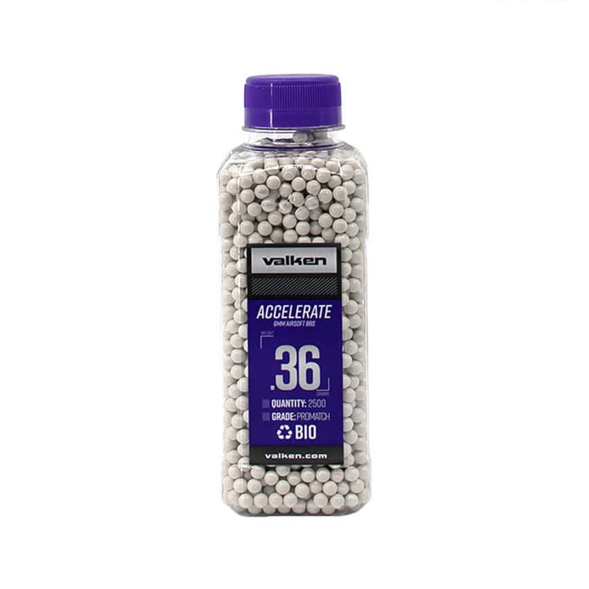 The Valken Accelerate ProMatch biodegradable airsoft BBs are manufactured in Taiwan by one of the best known Airsoft BB manufacturers. These 6mm airsoft BBs are precision grade quality, completely spherical, contain less than 5% air bubbles, and polished multiple times throughout the production process to ensure that the BB is seamless and has no surface imperfections. These 6mm precision BBs give you greater accuracy and consistency, and they are packaged in a unique rectangular bottle with a screw-on cap making storage, transport, and loading simple and convenient. Our BIO BBs are made from PLA (Polyactic Acid), which is recyclable and compostable thermoplastic derived from a renewable, earth friendly resource, such as corn starch. Accelerate BB bottles do not roll around like other round bottles, which can spill easily. We recommend our Valken M4 Magazine Style BB Speed Loader for use with Accelerate BBs when loading mid-cap magazines.